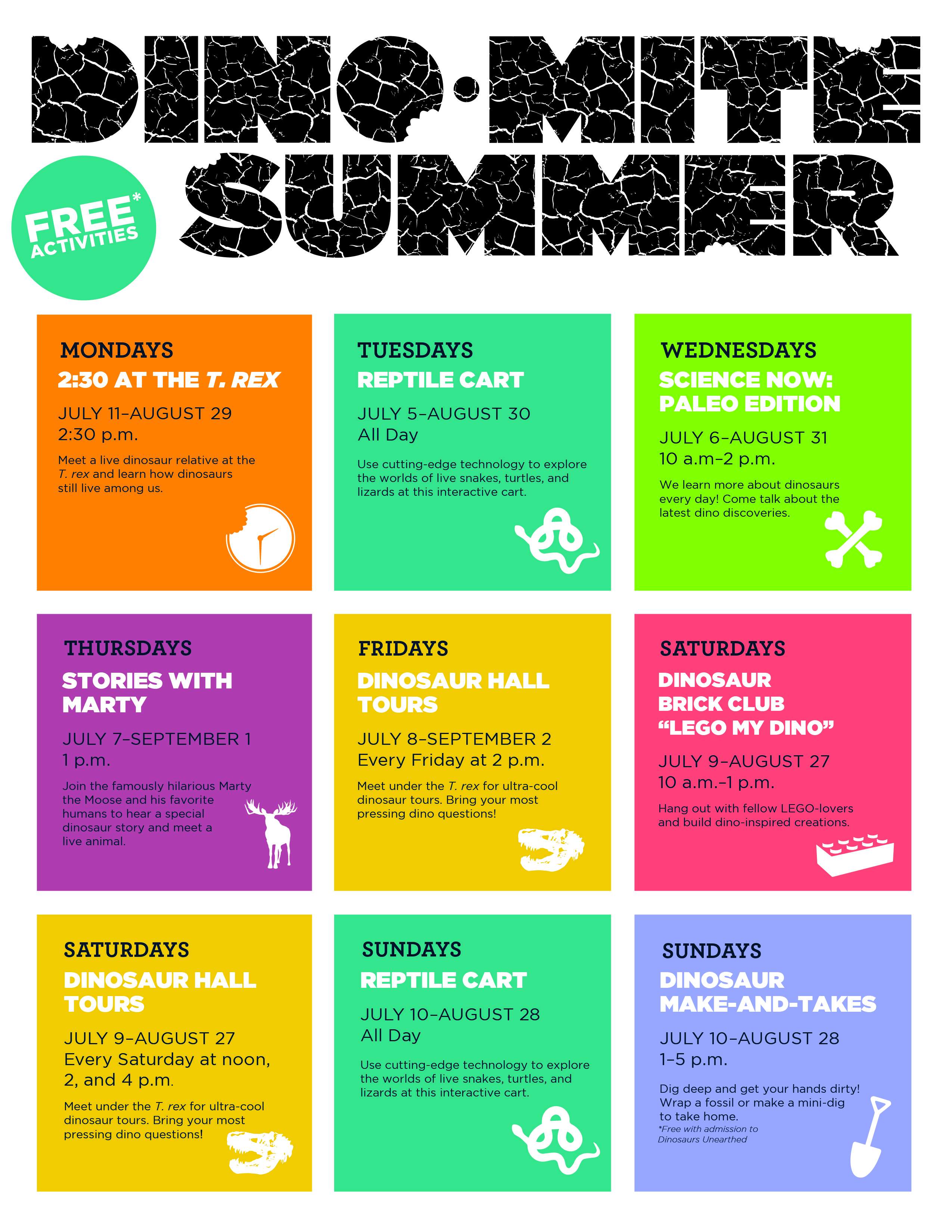 You might meet live dinosaur cousins, get the behind-the-scenes scoop during a tour of Dinosaur Hall, join fellow Lego-lovers and build dino-inspired creations, or share a belly laugh with Marty the Moose during story-telling time. With your Dinosaurs Unearthed admission ticket, you can even wrap your own fossil to take home. It’ll be the most explosive summer on (the fossil) record! Many tours and activities are free with admission. Here’s the schedule: