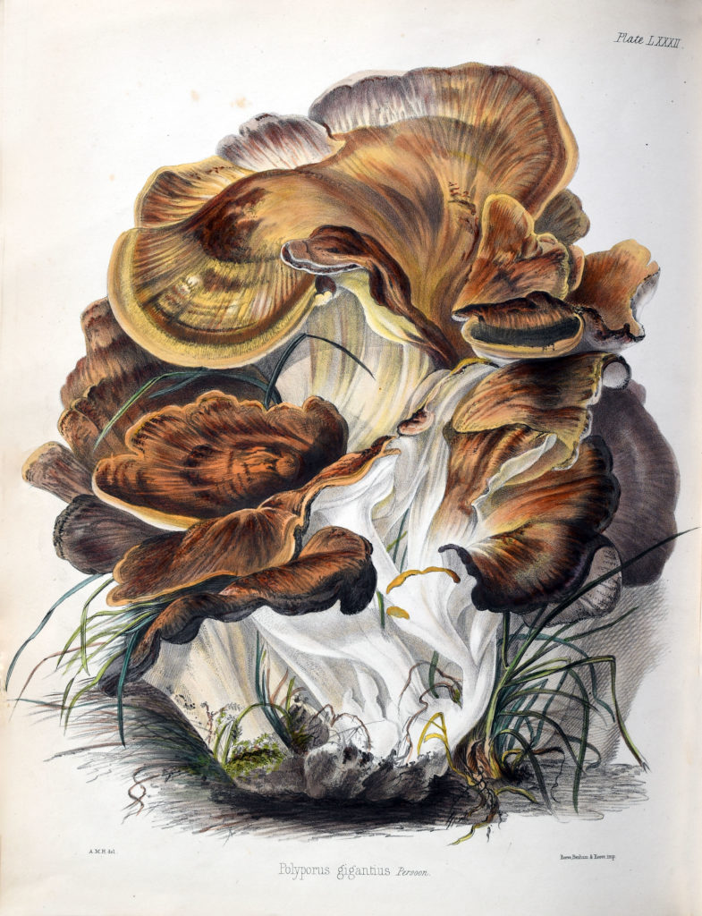 Hussey’s research culminated in a two-volume work published from 1847-1855, Illustrations of British mycology. Illustrations was comprised of 140 illustrations, noted by contemporary reviewers for their beauty and accuracy, by Hussey and her sister Frances Reed as well as text that contained scientific information for each fungus but also included engaging commentary on folklore, history and morality as well as gastronomical notes on the edible fungi. The same year, Hussey also illustrated Chares David Badham’s Treatise on the esculent funguses of England. She died in 1853, before the final volume of her life’s work could be published.
